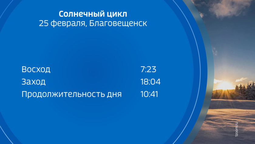 Продолжительность светового дня за неделю увеличилась ещё на 30 минут. 25 февраля восход солнца на широте Благовещенска в 7 часов 23 минуты, заход вечером в 6 часов 4 минуты, продолжительность светового дня составит 10 часов 41 минуту.