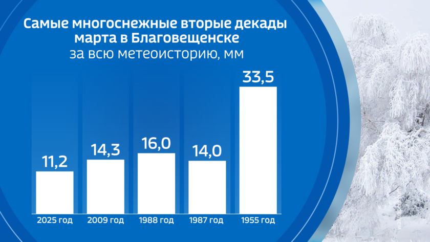 В тройке самых холодных за последние 10 лет – такой показатель второй декады марта в Благовещенске. По количеству осадков, доставшихся областному центру, она вошла в пятерку вторых декад месяца с самым большим количеством за весь период метеонаблюдений. Что касается предстоящей погоды – март планирует попрощаться с нами холодно.
