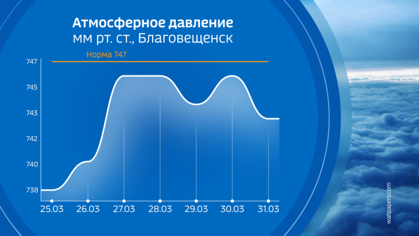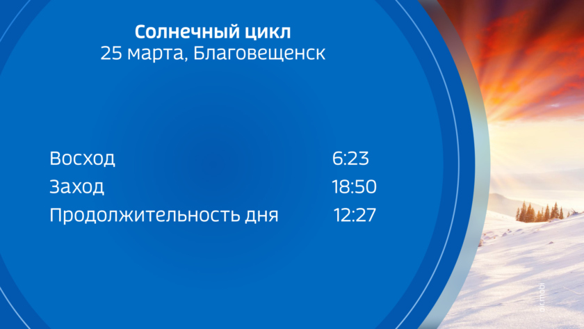 Продолжительность светового с начала марта увеличилась на 1,5 часа. 25 марта восход солнца на широте Благовещенска в 6 ч 23 минуты, заход вечером в 6 ч 50 минут, продолжительность светового дня составит 12 ч 27 минут.