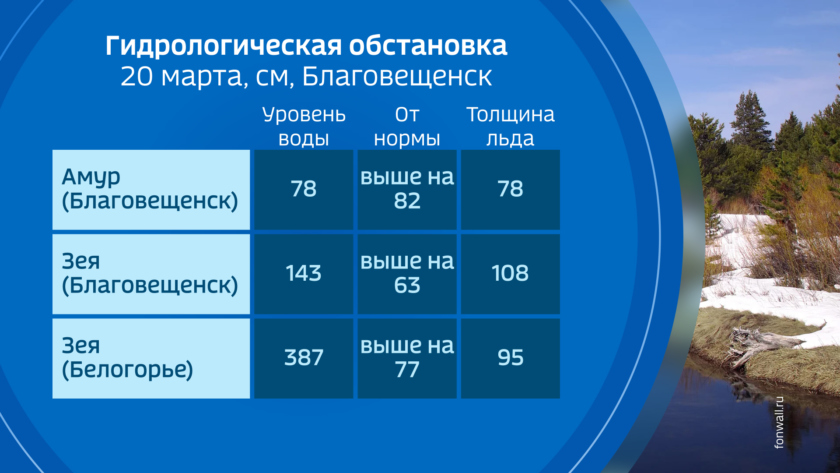 Несколько слов о гидрологической обстановке. По данным на утро 20 марта водность Амура и Зеи остается повышенной, на Селемдже средняя. Толщина льда в точках измерения на Амуре меньше нормы на 27-35 сантиметров, на Зее на 15-27, на Селемдже о Норска до Усть-Ульмы на 13-34 сантиметра.