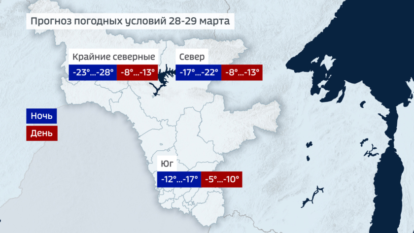 В пятницу и субботу температурный фон понизится еще на несколько градусов – на севере ночью около -20 °C, по крайним районам местами до -28 °C, -8-13 °C. На юге ночью -12-17 °C, днем -5-10 °C.