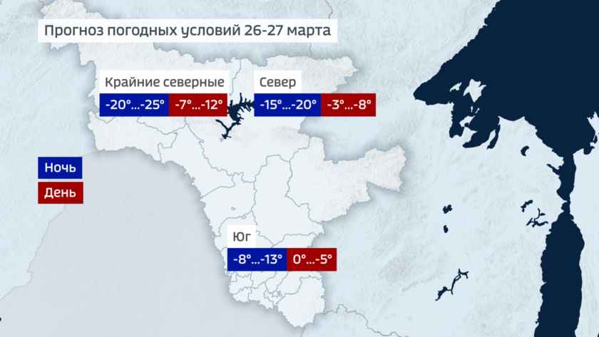 Температура в среду и четверг на севере области ночью -15-20 °C, местами до -25 °C, днем -3-8 °C, по крайним районам около -10 °C. На юге ночью -8-13 °C, днем 0-5 °C.