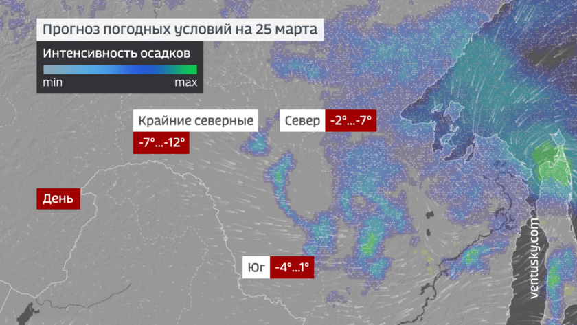 А сейчас о погоде предстоящей — днем во вторник зона осадков в виде небольшого снега останется лишь над северо-востоком области. Ветер снизит скорости до 6-11 м/с. Температура на севере -2-7 °C, по крайним районам около -10 °C мороза, на юге -4+1 °C.