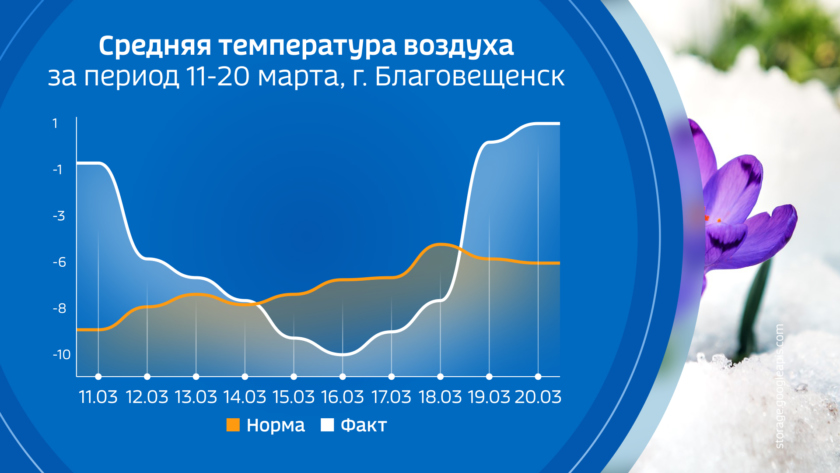 Кратко итоги второй декады марта — три активных циклона оказали значительное влияние на погодные условия в Приамурье. Их прохождение сопровождалось чередованием волн тепла и холода. В начале и конце декады температуры, как в южных, так и в северных районах области, максимально приближались, а порой и выходили на уровень «первоапрельских» значений. Однако также интенсивно в середине декады температуры «падали вниз» и оказывались ниже норм на 4-7 градусов.