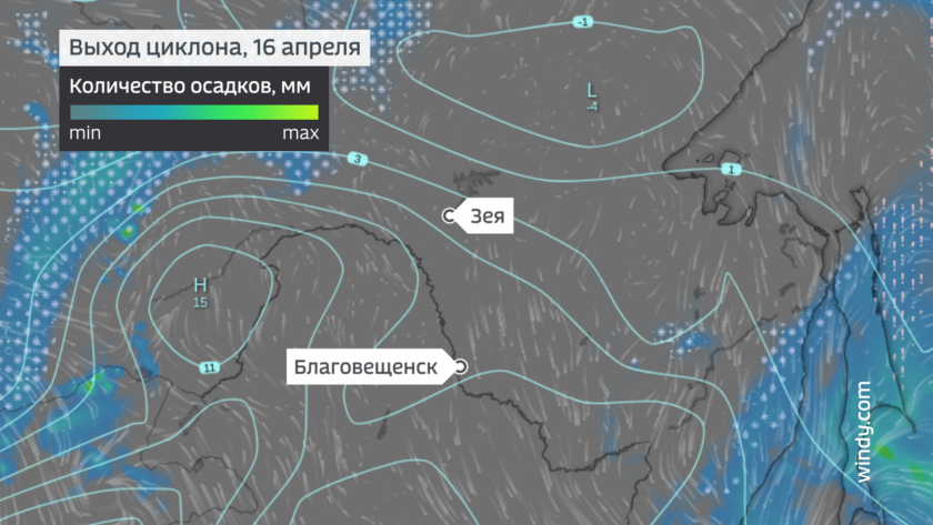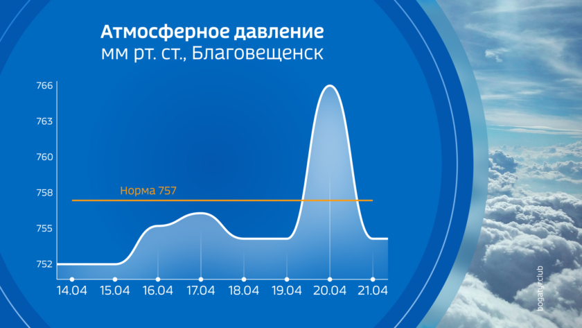 Температурный фон в апреле сильно зависит от многих факторов и очень быстро меняется. Вообще температурные качели характерны именно для переходного периода в апреле и октябре. Прошедший циклон как раз продемонстрировал большие суточные амплитуды и резкое изменение средних температур. Если в передней части циклона средняя температура в Благовещенске серьезно превышала норму, то в тылу прилично отстает от нее.