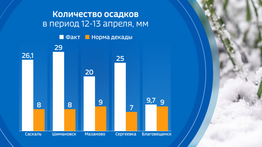 Снега в нынешнем апреле в Амурской области никак не могут полностью сойти. Каждый циклон, а их в апреле было уже несколько добавляет свежую порцию снежного покрова. Вот и циклон формировавший погоду в выходные принес большое, а местами очень большое количество осадков, преимущественно в виде мокрого снега. Основной удар стихии пришелся на центральную часть области. Количество осадков в Шимановском округе превысило норму месяца. Также осадков в три раза больше декадной нормы циклон принес в Сергеевку и в Дугду. В столице области общая сумма осадков различного фазового состояния составила почти 10 мм, то есть чуть больше декадной нормы.