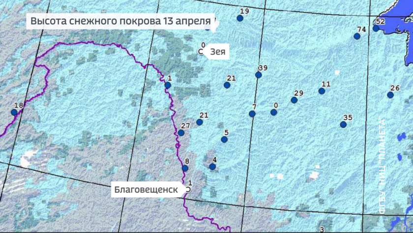 Снежный покров фиксируется по всей области, однако в долине Амура только его следы, с продвижением на север и восток высота снежного покрова еще от 7 до 30 сантиметров. Максимальная высота по прежнему в Береговом, она составляет 44 сантиметров, но интенсивность таяния высокая 10 сантиметров за неделю, несмотря на влияние циклона.