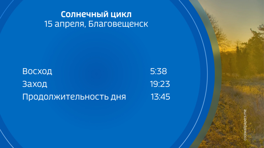 Восход солнца во вторник, 15 апреля в 5:38, заход в 19:23, продолжительность светлого времени суток 13 часов 45 минуты.