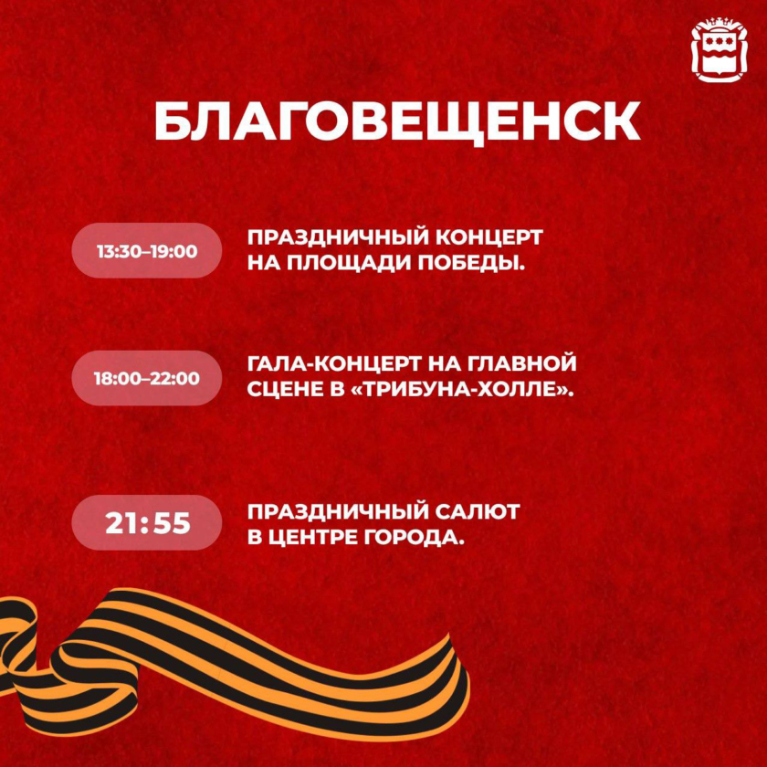 Концертная программа начнётся в четыре часа на площади Победы и в шесть вечера — на основной сцене «Трибуны Холл». Завершится празднование в амурской столице 80-летия окончания Великой Отечественной войны фейерверком в 21:55.