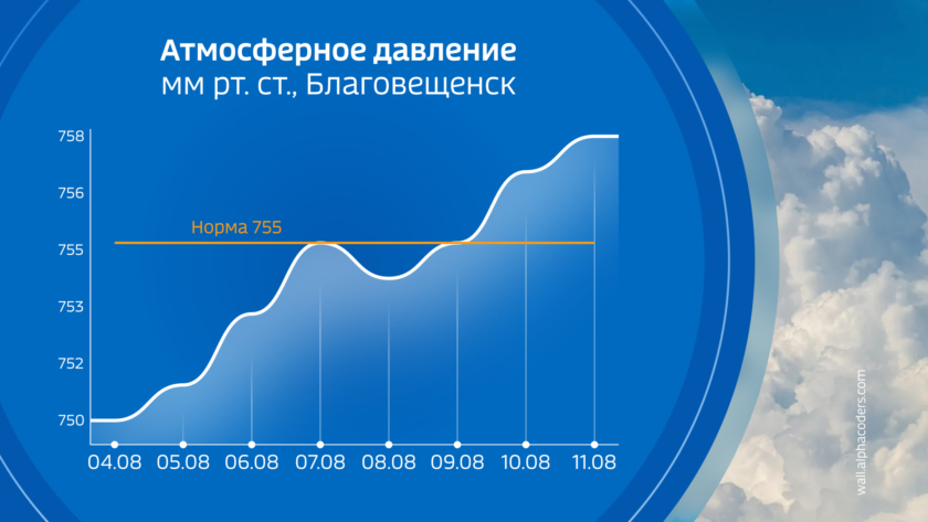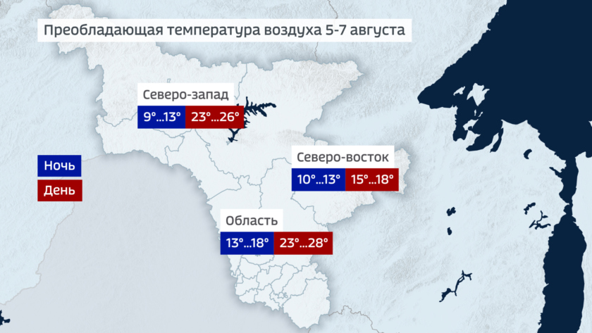 Погода первой половины недели в Амурской области относительно стабильна. Местами не исключены кратковременные дожди, однако существенных осадков не ожидается. Температура ночью 13-18 градусов, по северо-западным и северо-восточным районам прохладнее: 10-13. Днем 23-28, на северо-западе около 20. В северо-восточных районах, которые все еще находятся в западной периферии циклона с центром на Сахалине не выше 15-18 градусов.