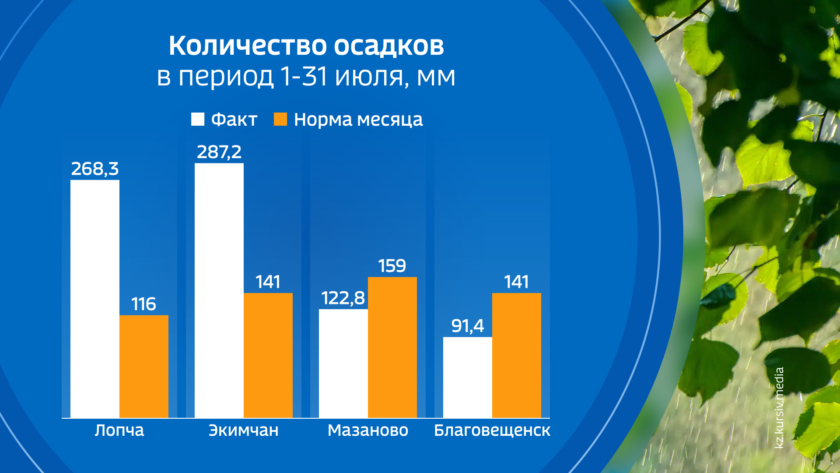Июль с точки зрения дождливости был не совсем однозначным. Безусловно дождливым его можно назвать в северо-западных и северо-восточных районах, где дождь шел с различной интенсивностью и часто. На большей части области серьезных дождей не наблюдалось почти весь месяц и превышение климатической нормы обеспечил один единственный циклон, прошедший в конце месяца. А местами в южных и центральных районах даже он не смог пополнить дождевые запасы. Максимальное количество дождя досталось Экимчану, минимальное — городу Благовещенск.