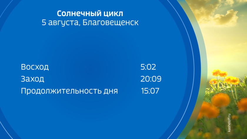 Восход солнца на широте Благовещенска во вторник, 5 августа в 5:02, заход в 20:09, продолжительность светлого времени суток 15 часов 7 минут. Со времени июньского солнцестояния день сократился на 1 час 20 мин.