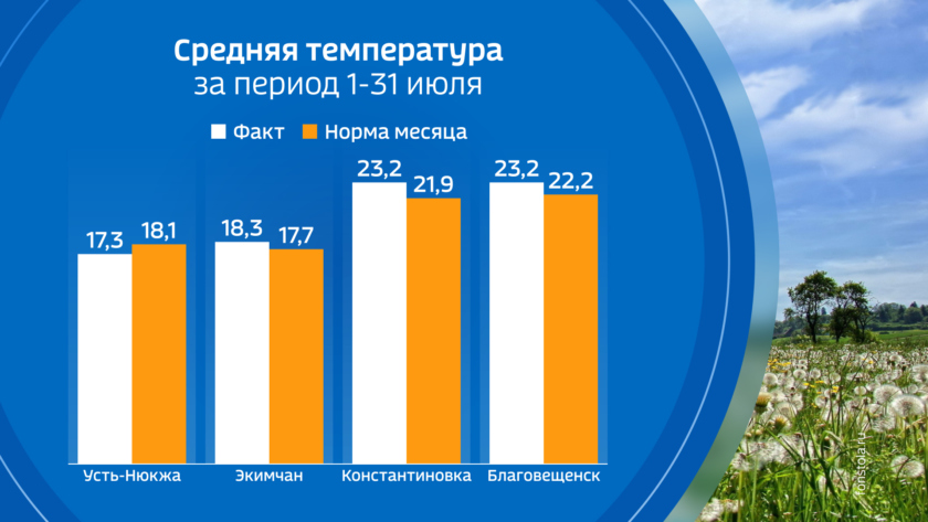 Что касается июльской жары, то она была обычной, в пределах климатической нормы. Небольшое превышение над нормой – около градуса отмечено местами на юге, максимально в Константиновке – выше нормы на 1,3 десятых градуса. и Екатеринославке. А в Тындинском и местами Зейском округах средняя температура воздуха немного не дотянула до нормы месяца.