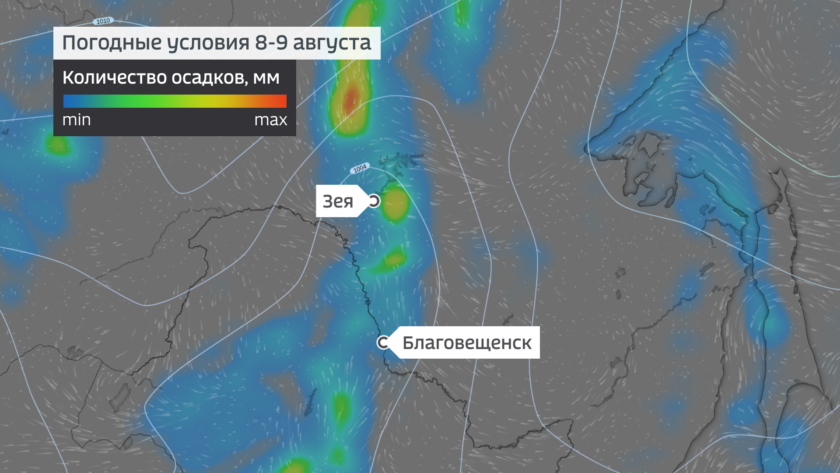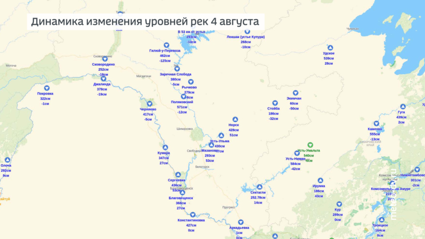 Прошедшие дожди безусловно влияют на уровень рек, малые реки в течении месяца периодически выходили из берегов. Подъемы идут и на основных реках, но пропускная способность Амура, Зеи и Селемджи пока не вызывает опасений. По состоянию на 08:00 4 августа все реки в коренных берегах. На реке Амур растет от Сергеевки до Константиновки на 10-50 см/сутки, выше и ниже спады уровней воды. На реке Зея подьемы уровней воды на участке с. Мазаново – устье до 50 см/сутки, на Селемдже уровень падает от Экимчана до Стойбы, ниже по течению подъем на полметра. Водность основных рек повышенная, выше нормы на 40-130 сантиметров.