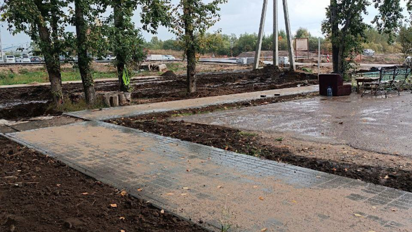 На территории в районе домов № 1-10, 2 уже укладывают тротуарную плитку и идет подготовка к установке малых архитектурных форм.