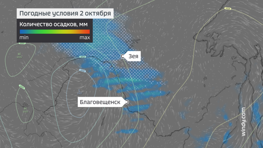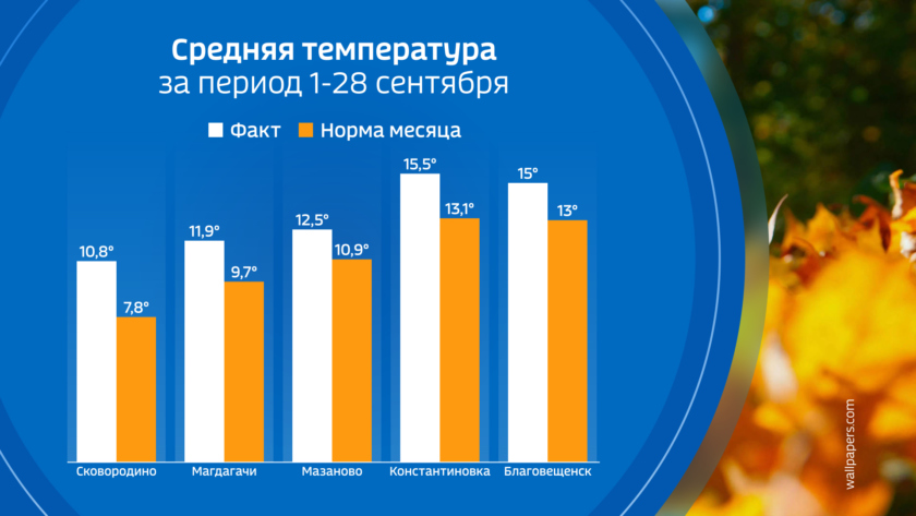 Сентябрь 2025 года был довольно дождливым, особенно на севере региона. Максимальное количество осадков, в три раза превышающее климатическую норму, выпало в Магдагачинском округе, в два раза больше нормы — в Сковородинском, Зейском и Михайловском районах. В Благовещенске количество осадков соответствовало климатической норме.