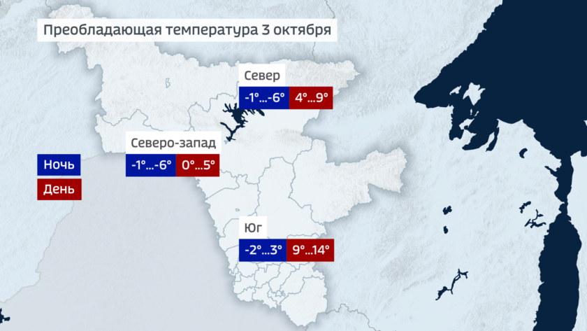 В пятницу ночью на севере ожидается минус 1 — минус 6 градусов, на юге около нуля. Днем ночью по северу температура достигнет 4-9 градусов, на юге — 9-14 градусов, на северо-западе — от 0 до 5 градусов.