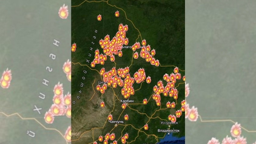 Согласно данным системы мониторинга «Рослесхоза», основная концентрация термоточек зафиксирована в районах, прилегающих к Бурейскому округу и Свободненскому району. Южный ветер относит дым на российскую сторону.