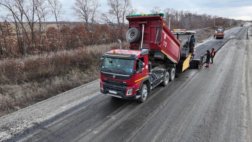 Строители продолжают ремонт дороги Екатеринославка — Тамбовка — Константиновка. На участке с 7 по 27 километр укладывают нижний слой асфальтобетонного покрытия