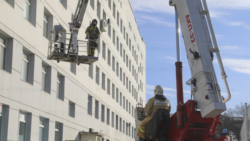 Пожарно-тактические учения провели огнеборцы в здании Благовещенской клинической больницы. По сценарию тренировки, возгорание произошло из-за неисправности электрооборудования на втором этаже хирургического корпуса.