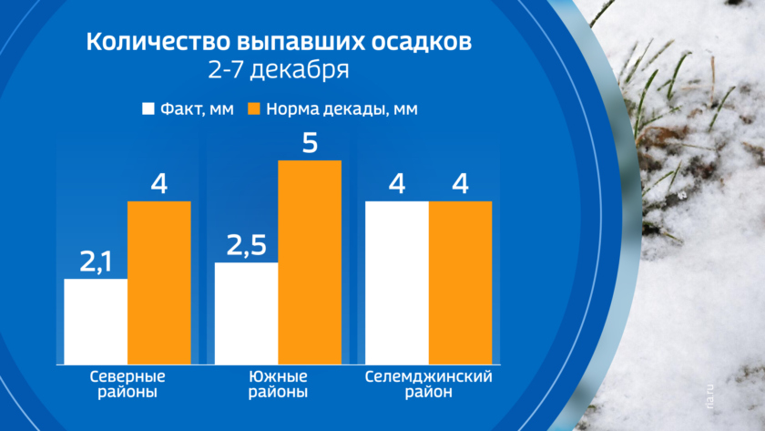 Тёплый ноябрь с обильными осадками отодвинул сроки ледостава на Амуре и Зее. Амурские гидрологи перешли на зимний режим работы с измерением параметров один раз в сутки каждые пять дней. По данным на утро 5-го декабря на Амуре ледостав фиксировался по всему течению. Исключение — у села Гродеково — лёдход, у Иннокентьевки — ледяной покров с полыньями. На Зее у Мазаново — ледостав, далее по всему течению продолжается лёдход различной интенсивности. На Селемдже лёд встал.