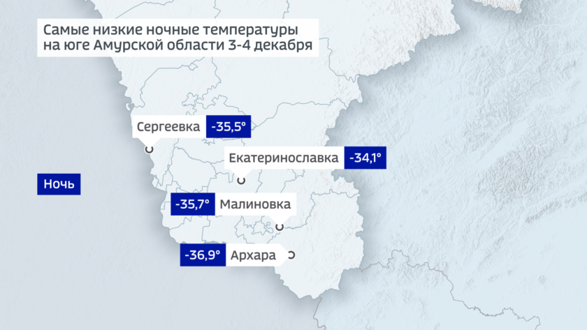 Так, 3 и 4 декабря метеостанции в Архаре и Малиновке зафиксировали температуру минус 36–37 градусов. До минус 34 опустилась температура в Екатеринославке. И даже в Благовещенском округе, на метеостанции села Сергеевка, которое находится в 60 км севернее столицы региона, в прошлую среду ночью было минус 35,5 градусов.