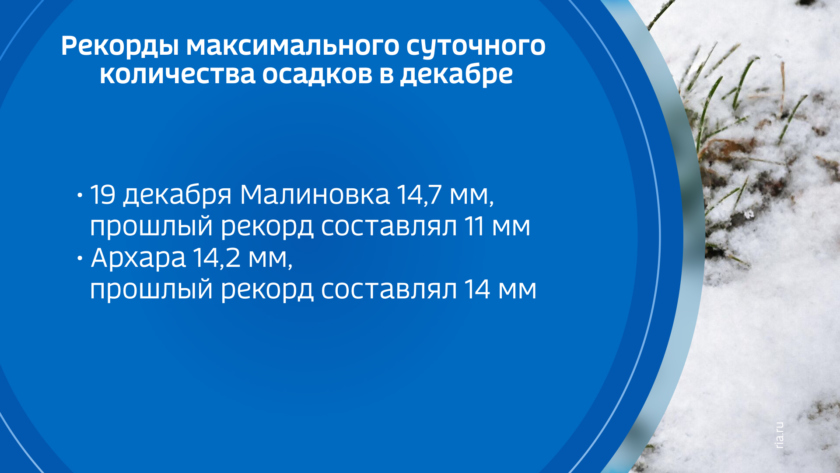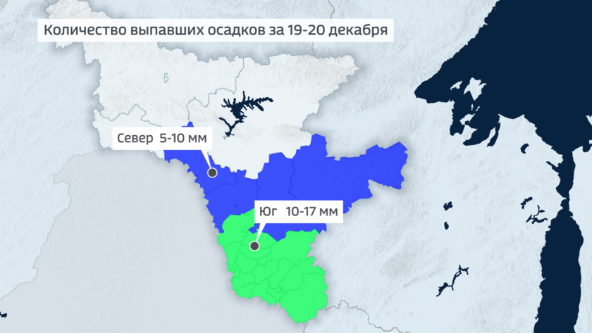Максимум снега досталось центральным и южным районам. 19 декабря по оперативным данным метеостанций на юге области наблюдалась серия рекордов — в Архаре и Малиновке были зафиксированы рекорды максимального суточного декабрьского количества осадков.