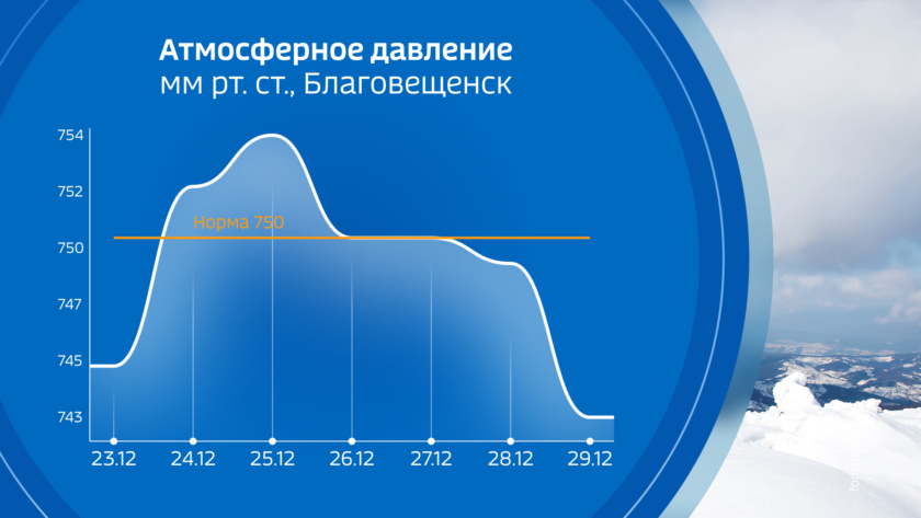 Что касается атмосферного давления на текущей неделе — во вторник, при прохождении циклона, его фон будет немного пониженным. В среду и четверг под влиянием антициклона — повышенным. С пятницы давление начнет медленно понижаться и до воскресенья останется в пределах нормы декабря. А к следующему понедельнику планирует опуститься значительно ниже нормы месяца.