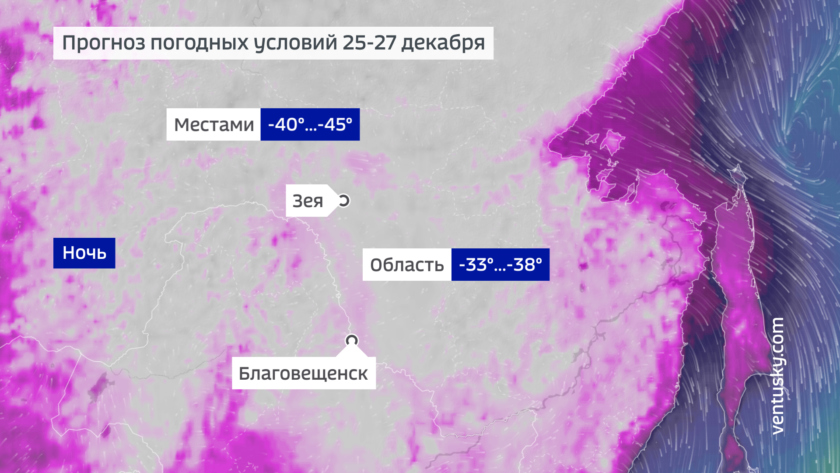 Со сменой воздушных потоков в тыл циклона устремился арктический холод. В ночь на понедельник 22 декабря преобладающий температурный фон по области составлял от минус 35 до минус 40. Самый низкий диапазон температуры фиксировали и на юге области. Так термометры на метеостанции Малиновка опустились практически до минус 41, на метеостанции Сергеевка Благовещенского округа было чуть ниже минус 40.