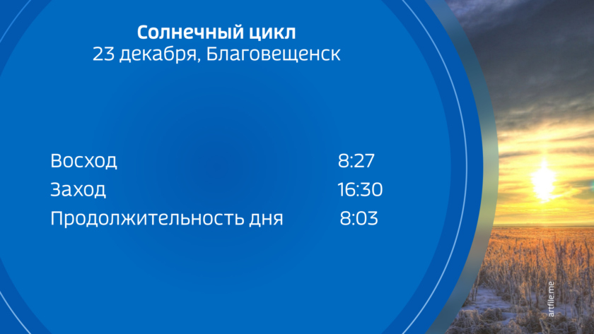В воскресенье 21 декабря в северном полушарии планеты наступило значимое астрономическое событие – день зимнего солнцестояния. В координатах Благовещенска период самых длинных ночей продлится до пятницы 26 декабря. С этого времени день станет постепенно увеличиваться в своей продолжительности. Во вторник 23 декабря восход солнца наступит в 8:27, заход вечером в 16:30, световой день продлится 8 ч 3 мин.