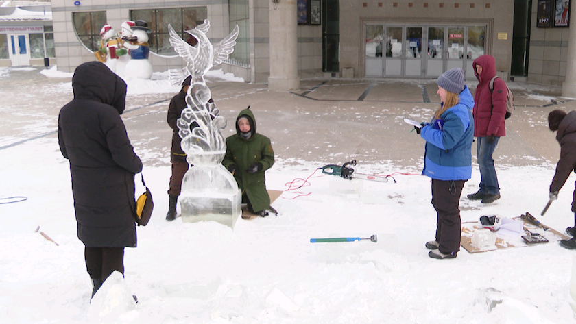 «Фигура вырезается из моноблока, по дизайну который заранее продумывается, основные части моноблока выпиливаются, прорезаются, потом идет обточка», — поделился участник конкурса по созданию ледовых фигур Алексей Зимников.
