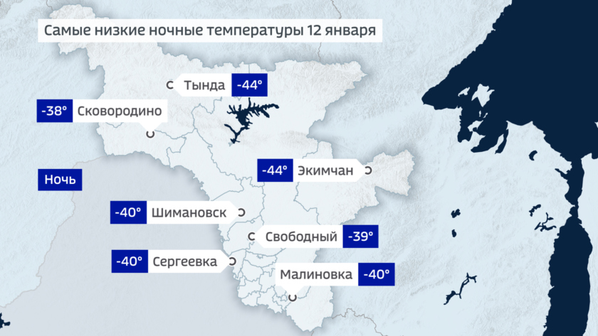На территории нашей области пик морозы достигли к воскресенью 11 января, уровень средних температур по области опустился ниже норм на 4-10 градусов. Показания температуры ночи 12 января по области были единодушны и максимально близки к отметкам минус 40 градусов. До 44 градусов опустилась температура в Экимчане и Тынде. Но это не первые столь низкие температуры в регионе в эту зиму.