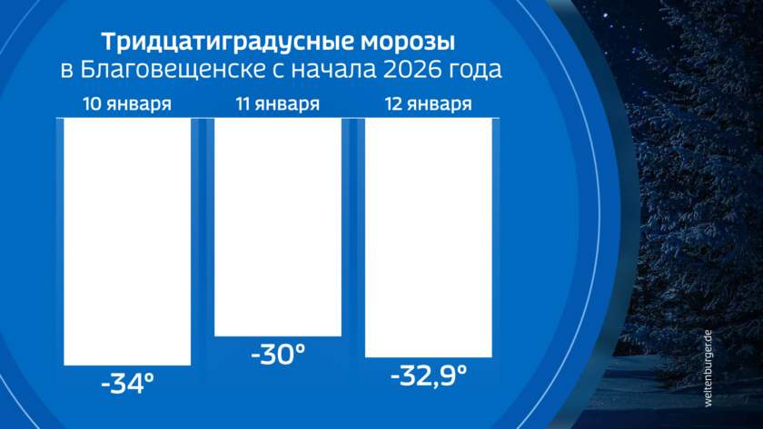 В Благовещенске с субботы 10 января фиксируются температуры минус 30 градусов и ниже. Самая низкая температура нынешней зимы пока отмечена в ночь на субботу 10 января минус 34 градуса. Так холодно в городе в этот период не было с 2022 года.