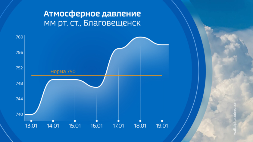 Значения атмосферного давления в первой половине недели будут близки к норме января, в пятницу опустятся ниже нормы. В дальнейшем ожидается их значительный рост — в выходные фон давления будет повышенным.