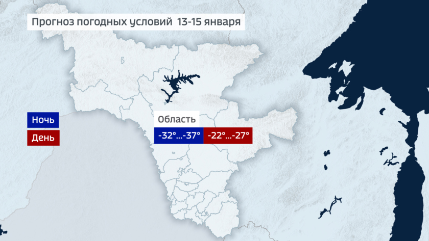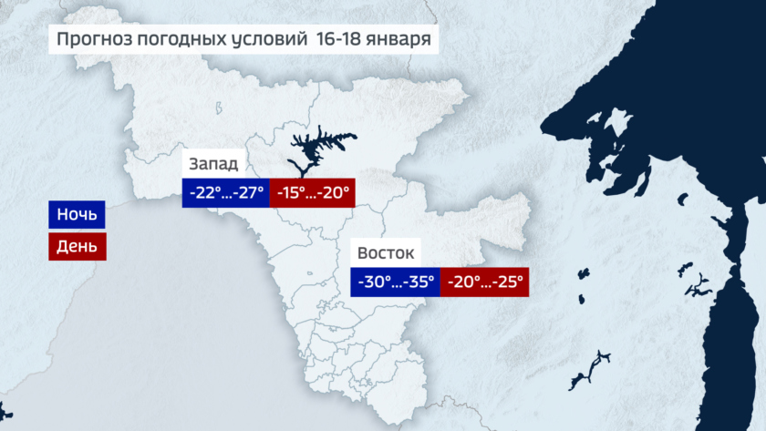 В понедельник 19 января, в христианский праздник Богоявление, по предварительному прогнозу в нашем регионе ожидается погода умеренно морозная, с небольшим снегом. По долине Амура днем вероятен умеренный ветер северо-западного направления. Ночные температуры составят 25-30, в отдельных районах ночное выхолаживание составит около -35, а днем минус 17-22, по крайним северным районам около 25 мороза.