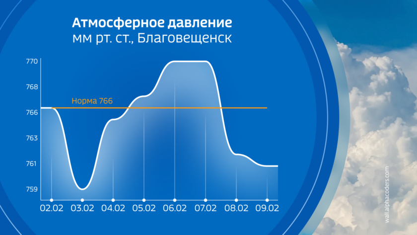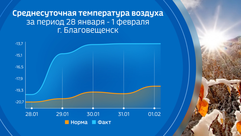 Амурская область продолжает находиться между двумя глобальными барическими системами. От близости того или иного центра зависит температурный фон в регионе. С 29 января в Приамурье хозяйничает более тёплый восточный воздух, и температура воздуха резко повысилась. Дневные температуры в Благовещенске колеблются около 10 градусов, среднесуточные температуры на несколько градусов превышают норму.