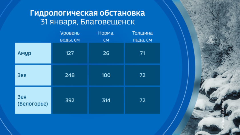 Уровень воды на Амуре в районе Благовещенска по состоянию на 31 января выше нормы на метр, на Зее у Благовещенска — на полтора метра, у Белогорья — на 78 сантиметров. Толщина льда около 70 сантиметров, на 20–25 сантиметров ниже нормы.