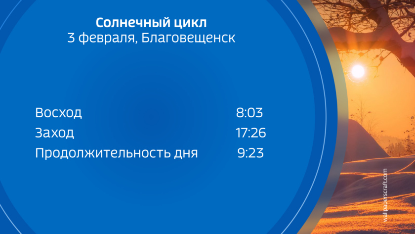 Восход солнца на широте Благовещенска во вторник, 3 февраля, в 08:03, заход в 17:26, продолжительность светлого времени суток — 9 часов 23 минуты.
