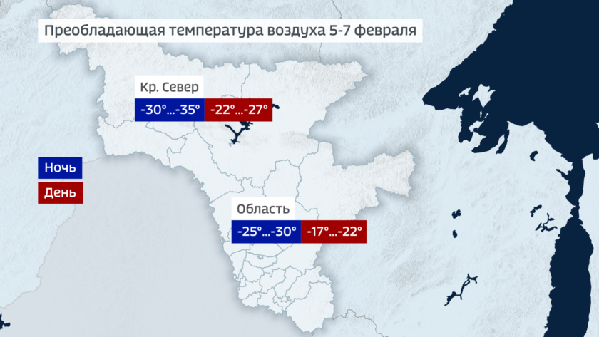 К четвергу сибирский антициклон и западные воздушные потоки окончательно завладеют инициативой. Ночью по области 25–30 градусов мороза, местами 30–35, главным образом в крайних северных районах и в пониженной сельской местности. Днём 17–22 на большей части территории области, местами 17–22.