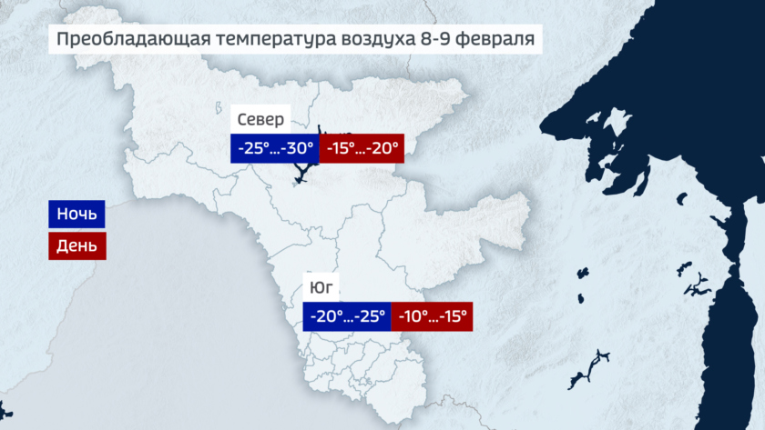 В воскресенье воздушные массы вновь сменят направление, и в регионе морозы немного ослабнут: по северу 25–30, в южных районах 20–25. Днём по северу 15–20, на юге 10–15 градусов мороза.