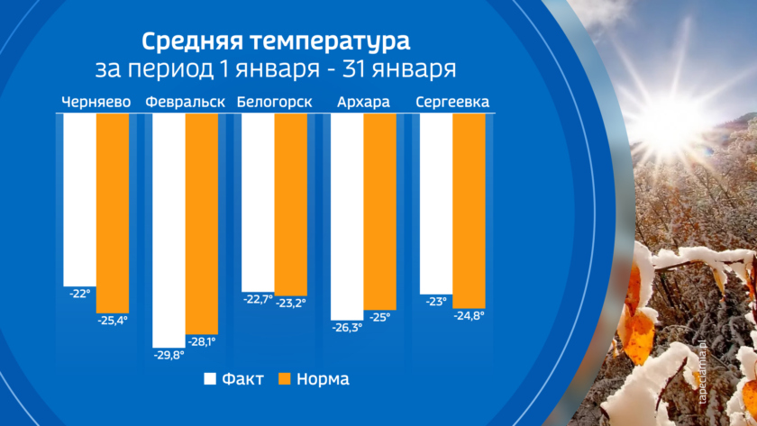 В целом самый суровый месяц года оказался не таким уж суровым. Ниже нормы средняя температура воздуха только на крайнем востоке, как на северо-, так и на юго-востоке. На большей части территории области средняя температура месяца в пределах и выше нормы. Максимальное отклонение от нормы в положительную сторону отмечено в долине реки Амур.