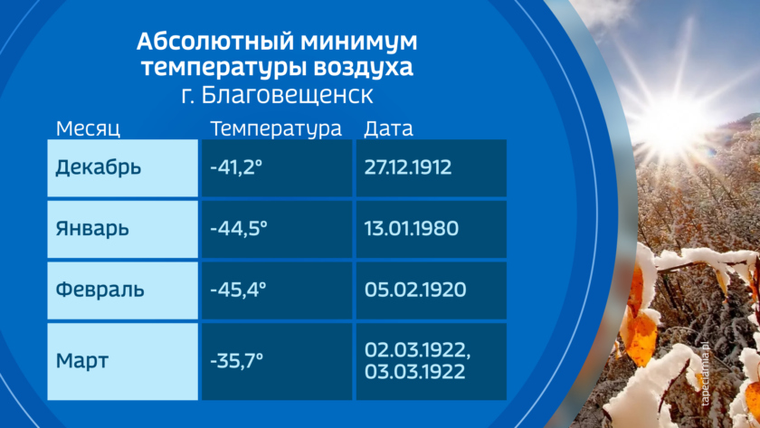 Такие обвалы холода случаются и несмотря на то что в феврале уже начинаются отдельные весенние процессы, все же это глубокий зимний месяц и абсолютный минимум в столице области зафиксирован именно в феврале. Правда это было более 100 лет назад, но тоже 5 февраля. В 1920 году в эту ночь температура в Благовещенске достигла 45,4 градуса мороза.