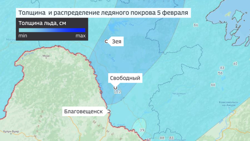 На реках области ровный ледостав, толщина льда нарастает, максимальная толщина льда, более метра по последним измерениям от 5 февраля — в бассейне р. Зея.
