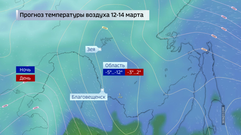 В период с 12 по 15 марта при прохождении фронтальных систем юго-западного циклона на территории Амурской области ожидаются изменения погодных условий. Днём 12 и в течение 13 марта преимущественно в северо-западных районах, 14–15 марта в большинстве районов региона ожидаются осадки различной интенсивности (снег, днём мокрый снег). Их суммарное количество за период прохождения циклона предполагается в количестве от 50 до 70% месячной нормы, местами в северо-западных районах — с превышением месячных норм в 1,5–2 раза. Смещение циклона будет сопровождаться усилением ветра до 10–13 м/с, гололедными явлениями на дорогах — гололедицей, снежным наката.