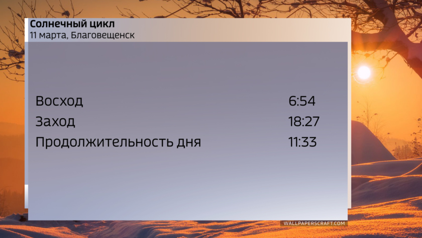 Восход солнца 11 марта в координатах Благовещенска — в 6 ч 54 мин, заход вечером — в 18 ч 27 мин. Световой день продлится 11 ч 33 мин, с начала месяца он увеличился на 33 минуты.