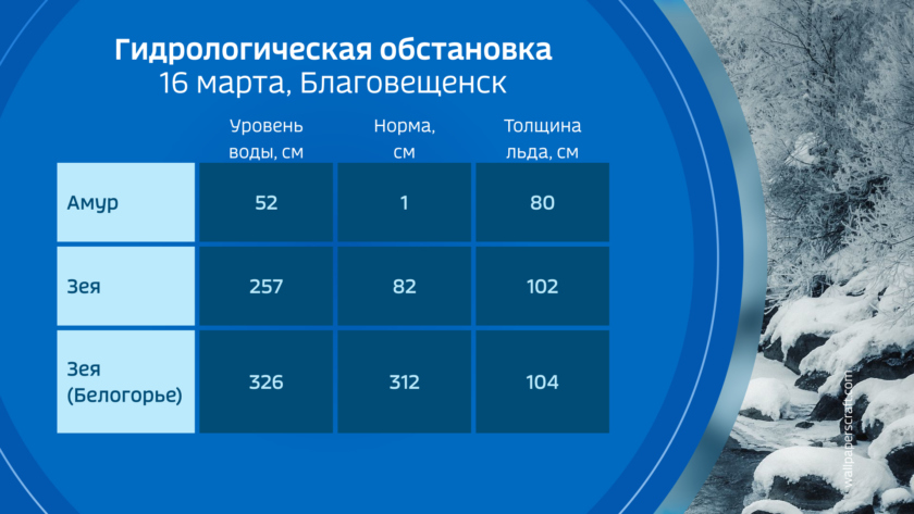 Толщина льда у города Благовещенск составляет 80-104 сантиметра, уровни воды выше нормы у Благовещенска на 51-175 сантиметров, у Белогорья на 14 сантиметров.