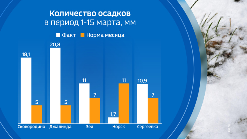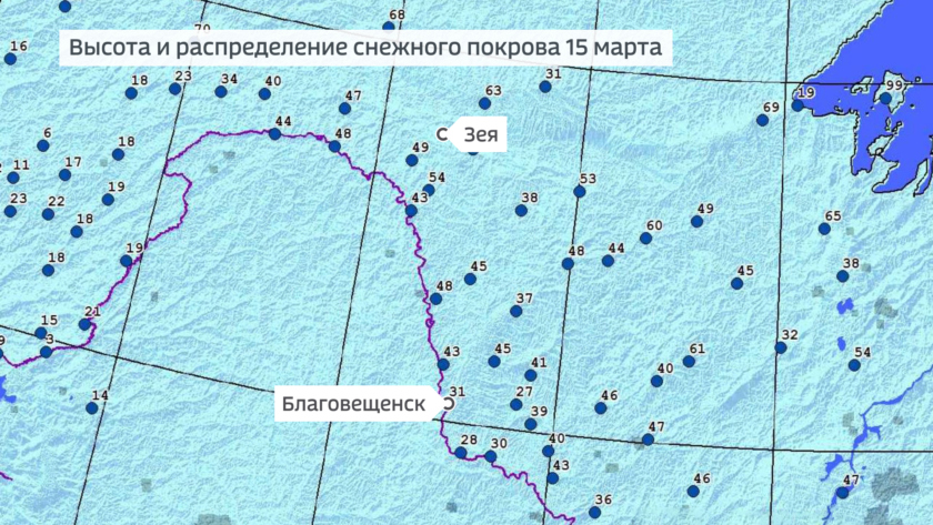 Прошедший в выходные снегопад принес в область от одного до 6 мм снега в жидком эквиваленте, что сравнимо с нормой двух мартовских декад. Больше всего снега в субботу выпало в городах Тында, Зея и Белогорск. В столице области превышен небольшой, но все же рекорд: суточное количество снега оказалось на две десятых миллиметра больше, чем когда-либо выпадало в Благовещенске 14 марта. Прежний рекорд со снегопадом в количестве 4 миллиметров был зафиксирован в 52 году прошлого столетия.