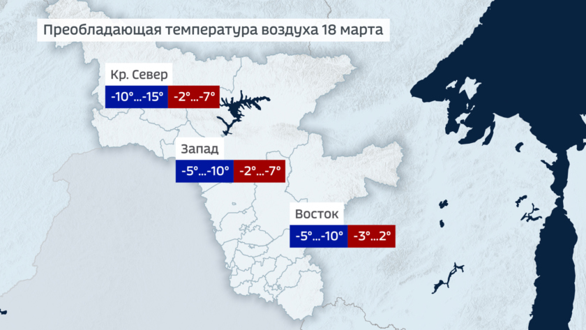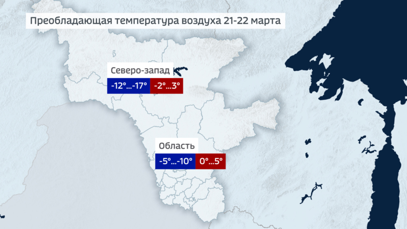 Что касается температуры воздуха, то ее фон будет зависеть от положения циклонического вихря. В среду ночью по области 5-10 мороза, в крайних северных районах 10-15. Днем в среду по западу минус 2 минус 7, на востоке около ноля.