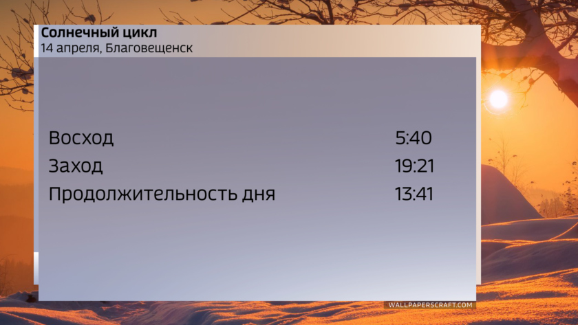 Восход Солнца 14 апреля в координатах Благовещенска наступит в 6 ч 40 минут, заход вечером в 21 минуту восьмого. Продолжительность светового дня составит 13 ч 41 минуту, плюс 48 минут с начала месяца.